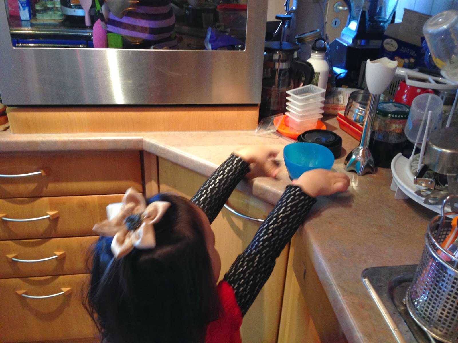 Now, as you know, I have been trying to implement lots of participation in the kitchen by the girls. One activity is that when I am doing the dishes, the girls would help somehow. This activity is not super efficient and it's something I would normally not do if I was just doing the dishes on my own, but since it gives them an activity and gives them an opportunity to "help," I do it (long, crazy sentence!). Anyway, I wash one of their dishes and put it on the counter by the sink, instead of the drying rack.
